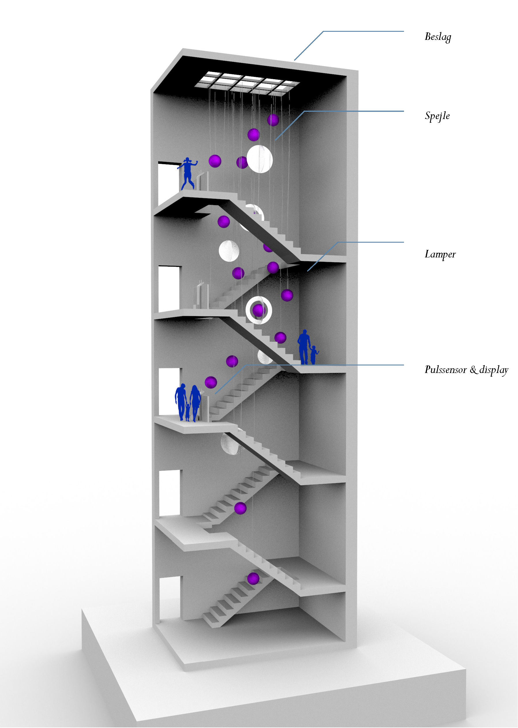 A continuous pulse-sensitive chandelier connects the three floors of the stairwell, providing a visual representation of heart rhythms. Each floor features a podium where children and adults can record their pulse and transmit it to the chandelier or view it on a screen in front of them, providing a truly immersive and physical understanding of their pulse.